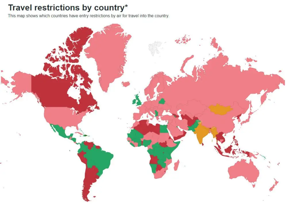 I use Kayak’s Travel Restriction by Country webpage. It’s easy to use and their color coated global map allows you to quickly see which countries are open (green), open with restrictions (light red), closed (dark red), or will be opening soon (yellow).